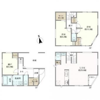 | 土地面積 | 60.76m2(18.3坪) 登記簿 別途私道負担12.57m2 | 建物延面積 | 117.53m2 車庫部分9.93m2含む |