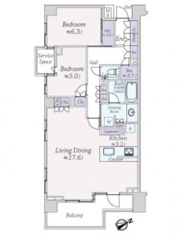 | 間取り | 2LDK | 専有面積 | 77.00m2(23.2坪) 壁芯 |