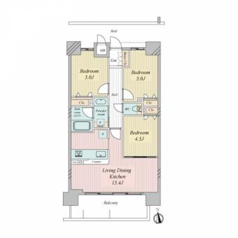 | 間取り | 3LDK | 専有面積 | 60.14m2(18.1坪) 壁芯 |