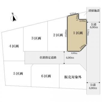 | 備考 | 対象不動産北側に清掃施設が設置されます。清掃施設5.31m2の持分1/6、位置指定道路80.71m2の持分1/6がございます。 ■総戸数/区画数:6 販売戸数/区画数:1 |