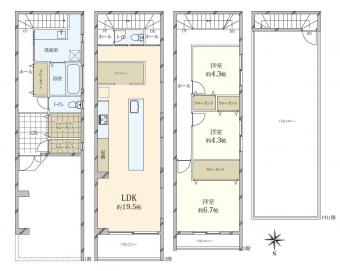 | 土地面積 | 62.61m2(18.9坪) 登記簿 別途私道負担8.66m2 | 建物延面積 | 126.49m2 |