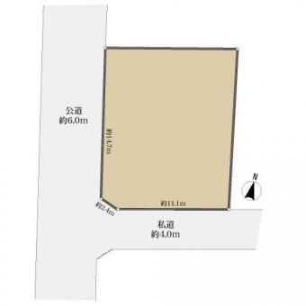 | 接道状況 | 角地 南西約6.0m公道、間口:約14.7m(位置指定道路) 南東約4.0m私道、間口:約11.1m(位置指定道路) | ||