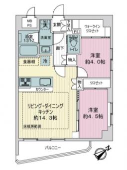 | 間取り | 2LDK | 専有面積 | 56.95m2(17.2坪) 壁芯 |
