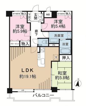| 間取り | 3LDK | 専有面積 | 80.19m2(24.2坪) 壁芯 |