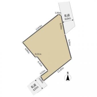 | 接道状況 | 二方 北東4.0m私道、間口:6.5m(位置指定道路) 南西4.0m私道、間口:2.0m(位置指定道路) | ||