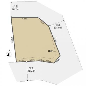 | 接道状況 | 三方 北約4.8m公道、間口:約8.4m 東約5.0m公道、間口:約14.3m 南約6.0m公道、間口:約12.1m | ||