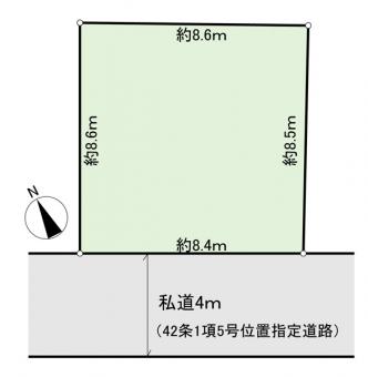 | 土地面積 | 74.74m2(22.6坪) 登記簿 別途私道負担87.86m2 | ||