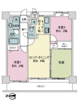 | 間取り | 3LDK | 専有面積 | 61.41m2(18.5坪) 壁芯 |