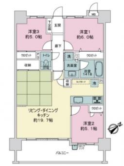 | 間取り | 3LDK | 専有面積 | 77.15m2(23.3坪) 壁芯 |