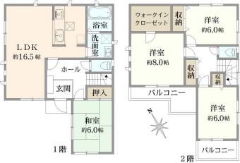 | 土地面積 | 108.64m2(32.8坪) 登記簿 別途私道負担9.76m2 | 建物延面積 | 105.99m2 |
