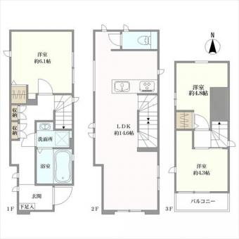 | 土地面積 | 47.72m2(14.4坪) 登記簿 別途私道負担約3.8m2 | 建物延面積 | 72.65m2 |