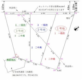 | 備考 | セットバック有、※その他通路部分の持ち分あり(182.34m2×1/4)※私道面積は持分(3分の1)で按分した面積です。風致地区(面積0.10m2)含む |
