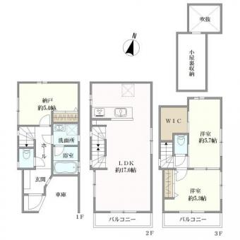 | 土地面積 | 51.86m2(15.6坪) 登記簿 別途私道負担3.43㎡(持分4分の1) | 建物延面積 | 89.30m2 車庫部分6.35m2含む |