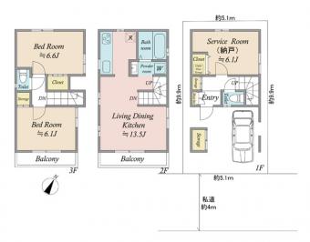 | 土地面積 | 51.26m2(15.5坪) 登記簿 別途私道負担42.49m2 | 建物延面積 | 77.42m2 |