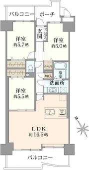 | 間取り | 3LDK | 専有面積 | 72.82m2(22.0坪) 壁芯 |