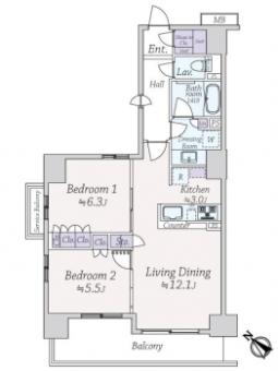 | 間取り | 2LDK | 専有面積 | 62.35m2(18.8坪) 壁芯 |