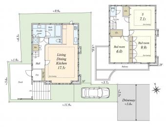 | 土地面積 | 138.19m2(41.8坪) 別途私道負担23.50m2 | 建物延面積 | 99.22m2 |