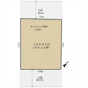 | 接道状況 | 二方 北西約3.6m公道、間口:約9.1m 南東約4.0m公道、間口:約8.8m | ||