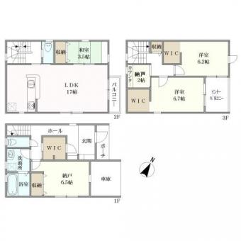 | 土地面積 | 85.14m2(25.7坪) 実測 | 建物延面積 | 125.05m2 車庫部分6.38m2含む |