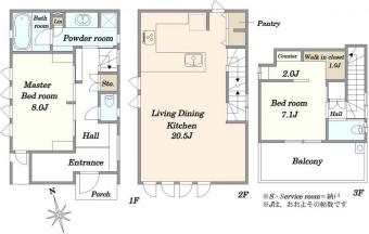 | 土地面積 | 56.50m2(17.0坪) 別途私道負担10.91m2 | 建物延面積 | 93.45m2 |