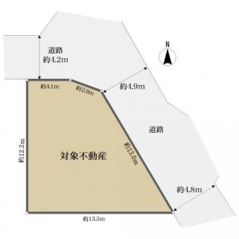 | 接道状況 | 角地 北約4.2m私道、間口:約4.1m(位置指定道路) 北東約4.8m私道、間口:約13.0m(位置指定道路) | ||
