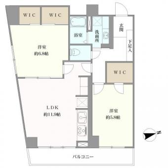 | 間取り | 2LDK+WIC(WIC=ウォークインクローゼット) | 専有面積 | 62.96m2(19.0坪) 壁芯 |