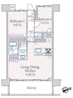 | 間取り | 2LDK | 専有面積 | 60.23m2(18.2坪) 壁芯 |