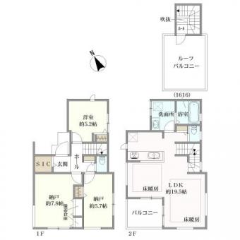| 土地面積 | 89.63m2(27.1坪) 実測 別途私道負担約0.9m2 | 建物延面積 | 90.77m2 |