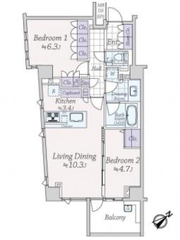 | 間取り | 2LDK | 専有面積 | 60.36m2(18.2坪) 壁芯 |