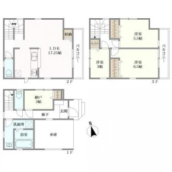 | 土地面積 | 62.10m2(18.7坪) 登記簿 | 建物延面積 | 101.25m2 車庫部分12.15m2含む |