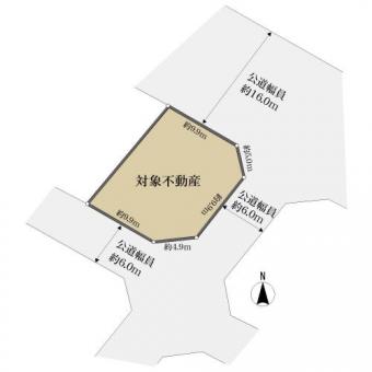 | 接道状況 | 三方 南東約6.0m公道、間口:約9.9m 南西約6.0m公道、間口:約9.9m 北東約16.0m公道、間口:約9.9m | ||