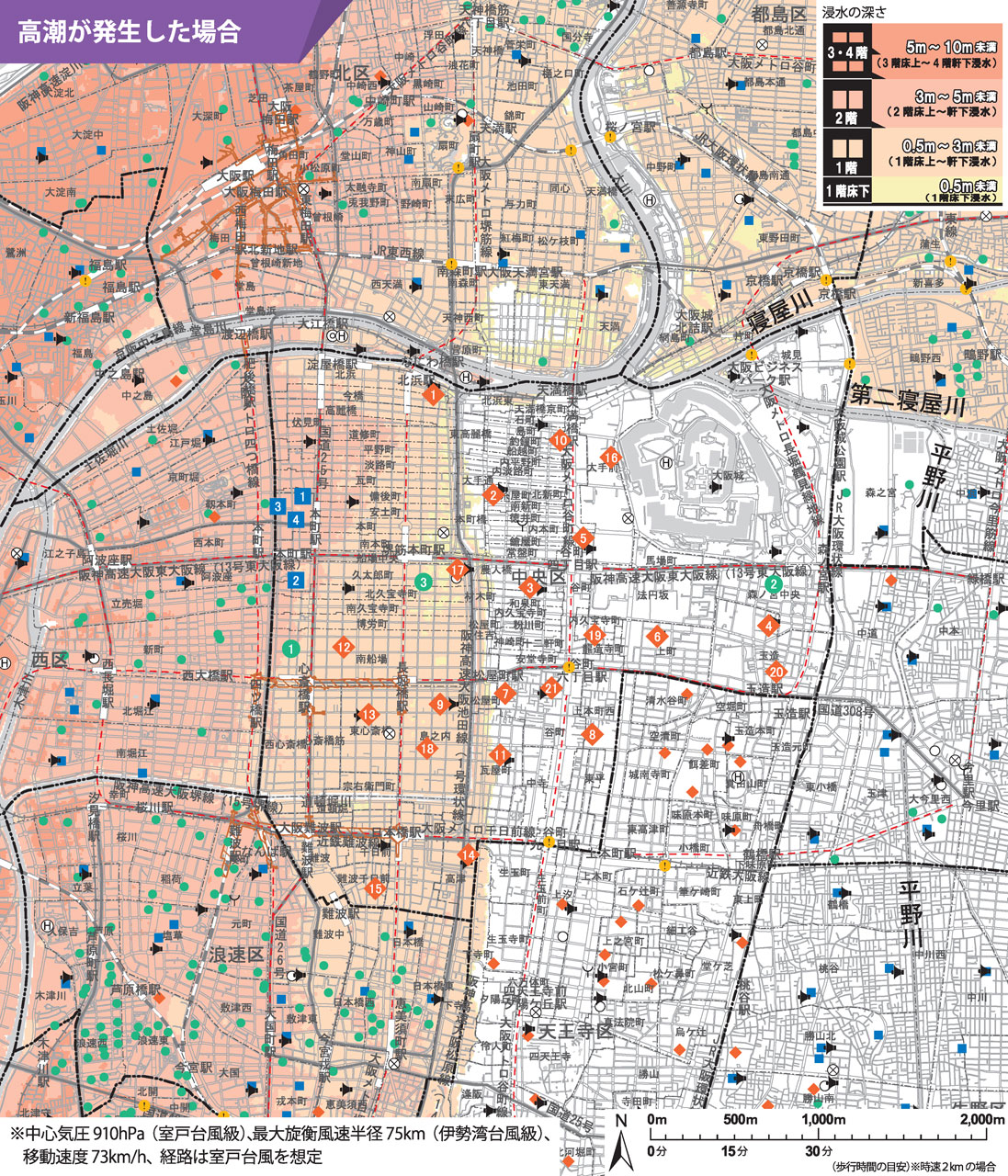 中央区の「水害ハザードマップ」では、淀川・大和川・寝屋川流域(寝屋川・第二寝屋川・平野川・平野川分水路・古川)の氾濫、高潮、内水氾濫、南海トラフ巨大地震による津波浸水のそれぞれについて、浸水の深さと範囲が示されています。特に、1934(昭和9)年の室戸台風と同等の中心気圧910hPaの台風が同じような経路をたどった場合の高潮では、中央区西部では1階から最大で2階天井程度に達する浸水が想定されています。