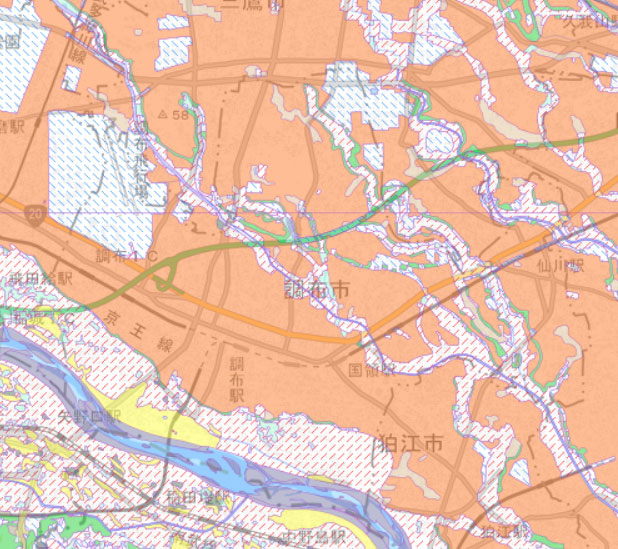 多摩川沿いにも赤色の斜線が広がっています。ここは多摩川が生み出した低地に盛土された「人工地形(盛土地・埋立地)」を示します。「京王多摩川駅」周辺の黄色の部分は、多摩川が運んできた土砂が堆積してできた「低地の微高地」です。