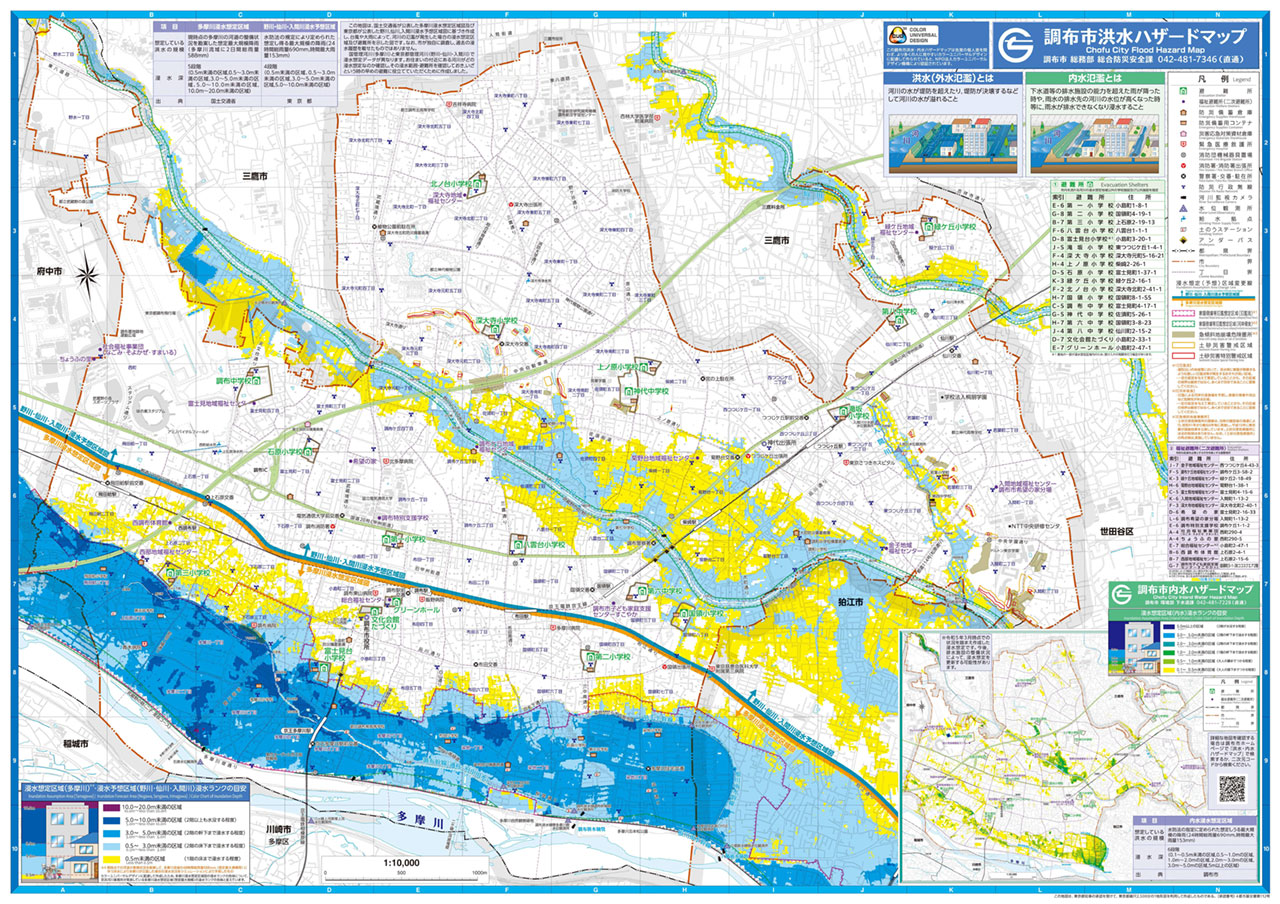 調布市では、「洪水・内水ハザードマップ」と「土砂災害ハザードマップ」を作成しています。