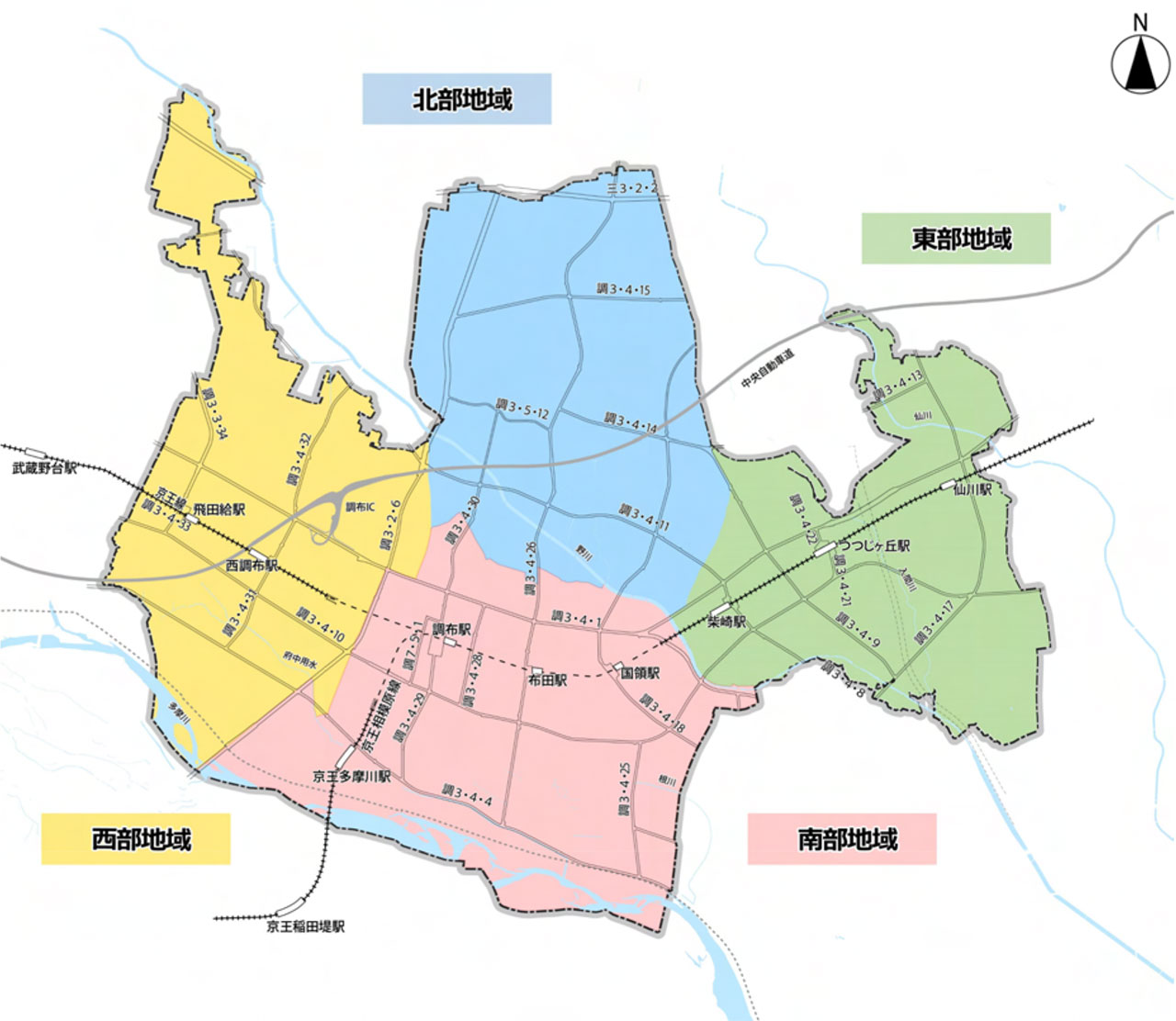 調布市では、都市計画上のマスタープランにおいて、市を4地域に区分しています。