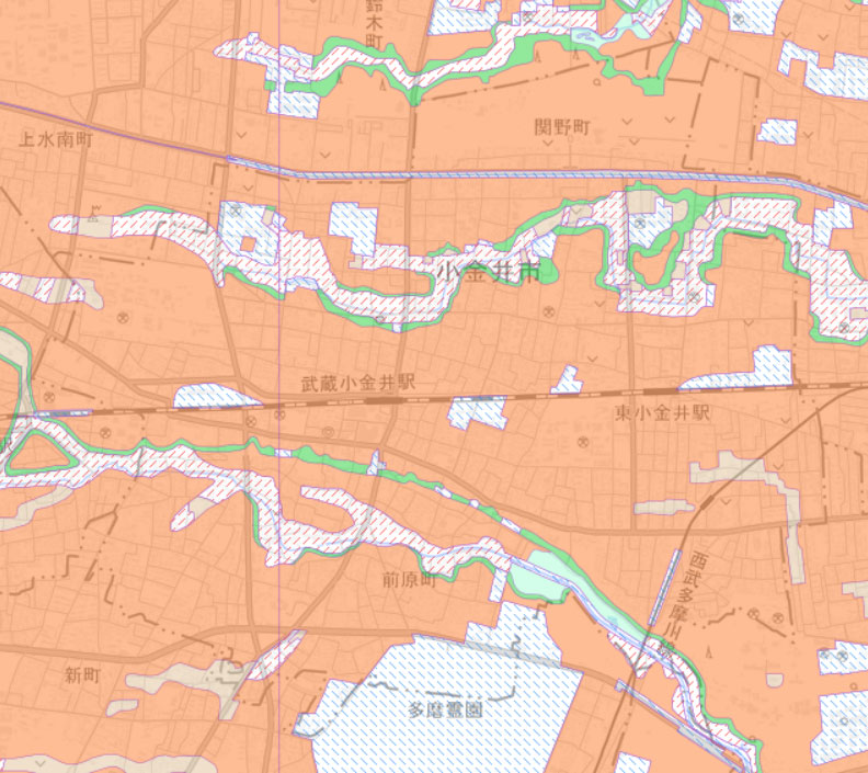 土地条件図で小金井市をみると、多くが「台地・段丘」を表すオレンジ色になっています。これは、武蔵野台地と呼ばれる台地です。図の中心あたりに位置するJR中央線の線路の南北には、白地に赤い斜線の「人工地形(盛土地・埋立地)」が概ね東西に延びています。線路の北側の該当部分は、武蔵野台地の間を流れる仙川の谷、線路南側の該当部分は、野川が作った谷で、それぞれそこに盛土した地形になっています。