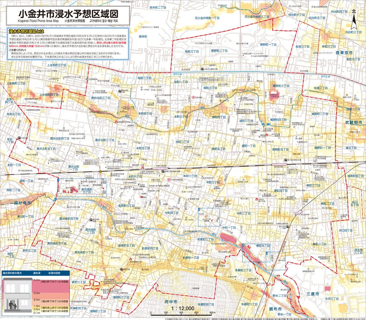 小金井市では「小金井市浸水予想区域図」を作成し、「小金井市防災マップ」に掲載しています。「小金井市浸水予想区域図」は、想定し得る最大降雨(総雨量690mm、時間最大雨量153mm)があった場合をシミュレーションした浸水深等を掲載しており、河川からの氾濫(外水)および下水道等による内水氾濫のそれぞれの影響を合わせて表示しています。