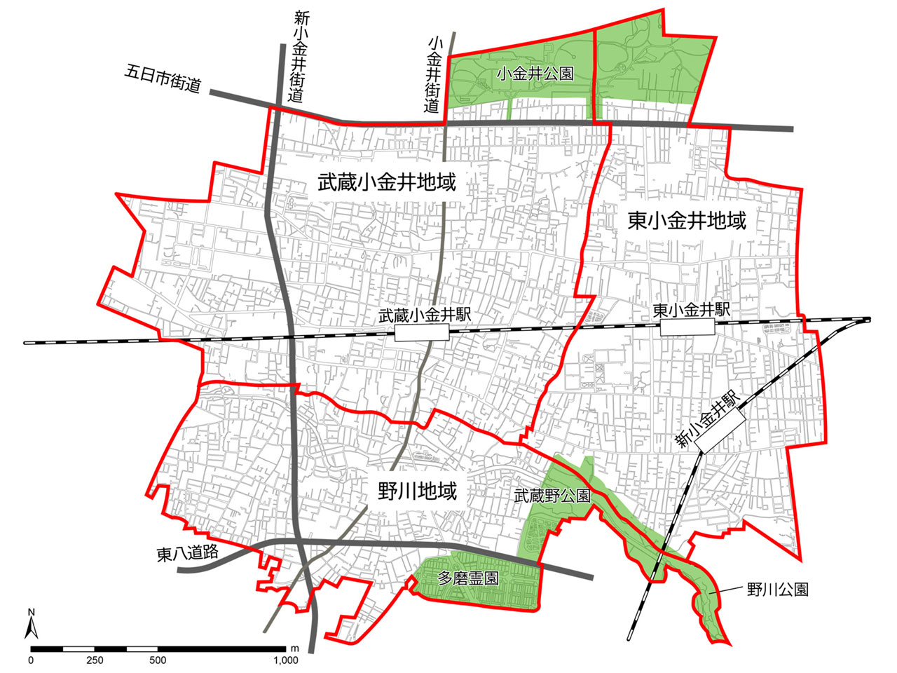 小金井市では、都市計画上のマスタープランにおいて、市を3地域に区分しています。