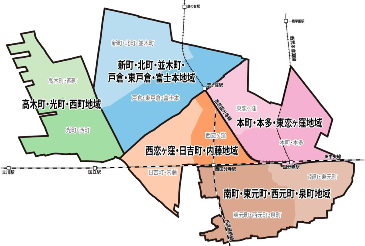国分寺市では、都市計画上のマスタープランにおいて、市を5つの地域に区分しています。