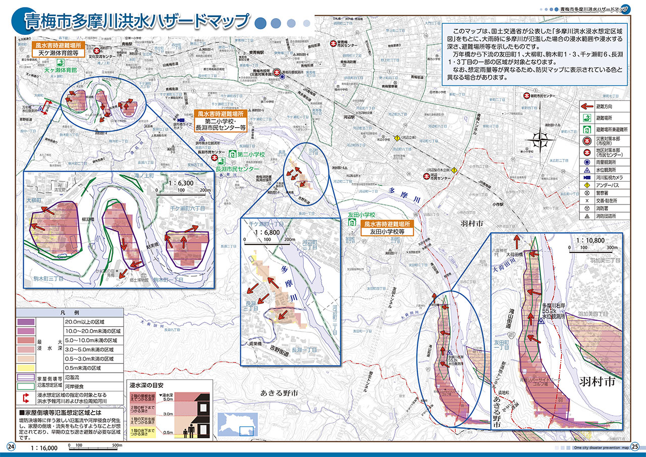 「防災マップ」内にも掲載のある「多摩川洪水ハザードマップ」では、多摩川流域で想定される最大規模の降雨(48時間総雨量588mm)が発生し、多摩川が氾濫した場合に予測される浸水の範囲と深さ、および避難場所等を示しています。万年橋より下流の友田町1丁目、大柳町、駒木町1丁目および3丁目、千ヶ瀬町6丁目、長淵1丁目および3丁目の一部などが、浸水が想定される区域です。