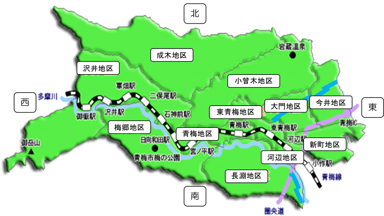 青梅市は、東京都の西北部に位置し、緑豊かな山並みと渓谷も擁します。標高千メートル近い山地や、多摩川沿いの比較的平坦な台地や丘陵地など、変化に富んだ地形となっています。災害リスクとしては、名栗断層と立川断層という2つの活断層が存在し、また山間部が多いため土砂災害への警戒が必要です。市による減災への取り組みは活発で、民間とも協力しながらさまざまな施策が行われています。