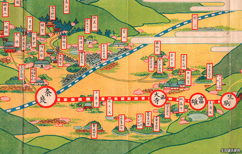 図は『奈良生駒ゆき電車線路案内』のうち、「生駒駅」から「奈良駅」(現「近鉄奈良駅」)までの区間を切り出したもの。