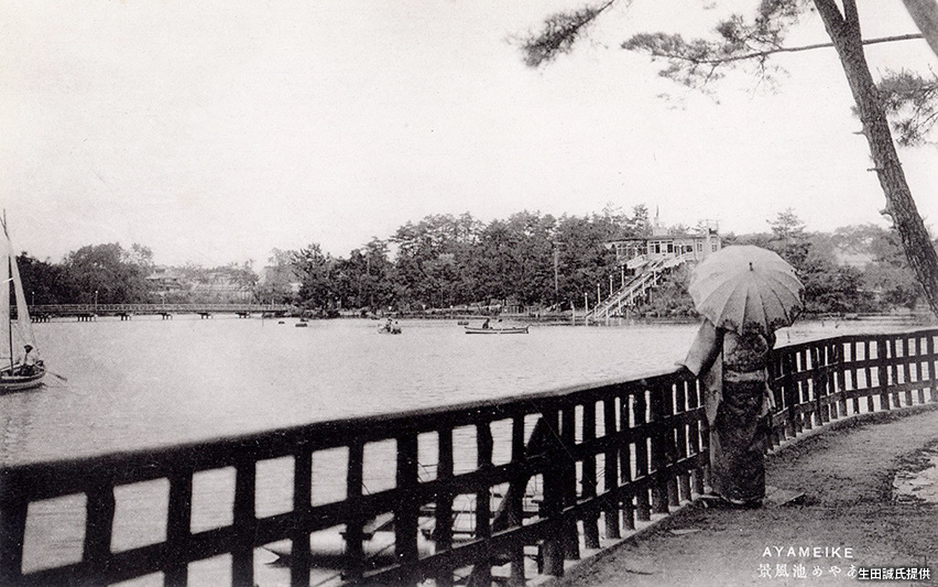 「大軌」は1919(大正8)年より「菖蒲池」周辺での土地開発を開始し、1923(大正12)年に「菖蒲池駅」を開設、1926(大正15)年には駅北側の「菖蒲池北園」に「あやめ池遊園地」を開園した。さらに1929(昭和4)年には、駅南側の「菖蒲池南園」に「あやめ池温泉場」を開設、駅の南北それぞれで観光地開発が進められた。写真は昭和戦前期の「あやめ池遊園地」で、ボート遊びをする人々のほか、右奥にはウォーターシュートも見える。