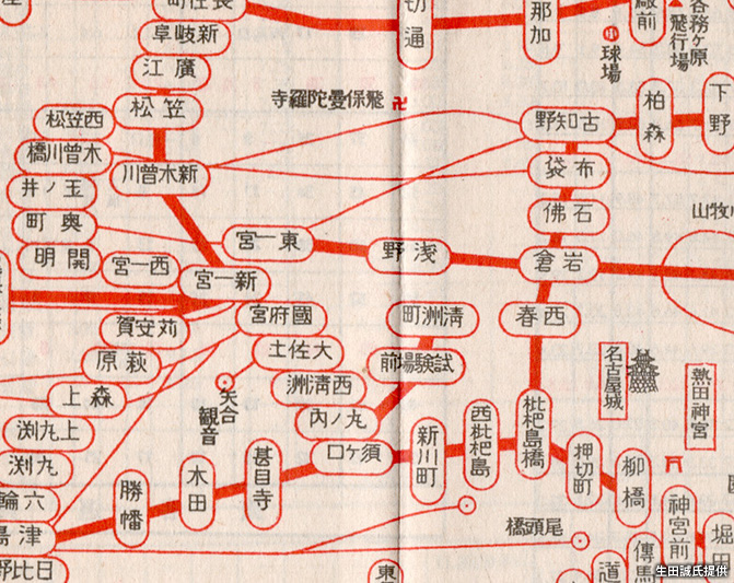 図は『名古屋鉄道線路案内図』のうち、旧「名岐鉄道」だった「柳橋駅」(現在は廃止)から「新岐阜駅」(現「名鉄岐阜駅」)までの区間を切り出したもの。