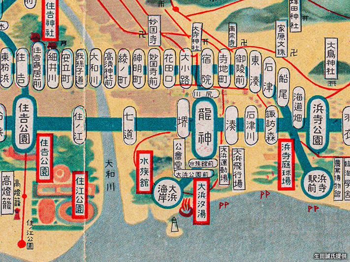図は『沿線案内 南海電車』のうち、「住吉公園駅」(現「住吉大社駅」)から「浜寺公園駅」までの区間を切り出したもの。