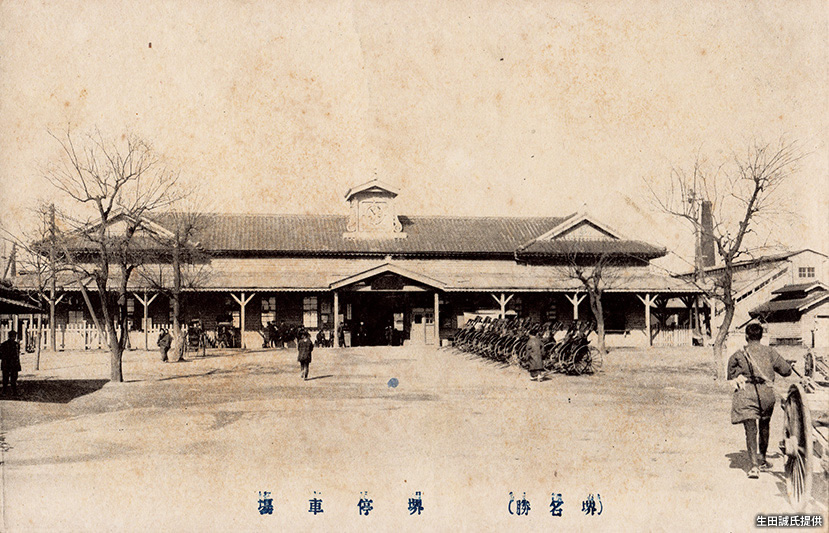 「阪堺鉄道」が1885(明治18)年に開業した当初、「大和川橋梁」が未完成であったため、暫定の終点「大和川駅」が橋の北側に置かれた。1888(明治21)年の「大和川橋梁」完成により「堺駅」まで延伸され「阪堺鉄道」は全通となった。写真は明治後期の「堺駅」。当初は「吾妻橋駅」とも呼ばれた。