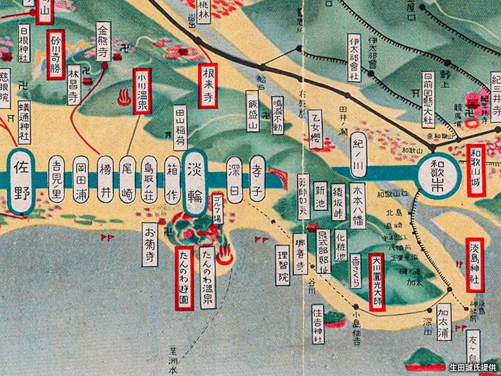 図は『沿線案内 南海電車』のうち、「佐野駅」(現「泉佐野駅」)から「和歌山市駅」までの区間を切り出したもの。
