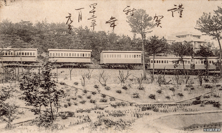 「南海鉄道」は明治後期に淡輪(たんのわ)の観光開発に乗り出し、1904(明治37)年に海水浴場(現「淡輪ときめきビーチ」)、1906(明治39)年に「淡輪駅」を開設した。駅の北に位置する「愛宕山」では「淡輪遊園」の整備が進められ、1911(明治44)年に本格開業、大正期になるとツツジが植樹され名所となった。写真は1908(明治41)年、「淡輪遊園」の園内に開設された「汽車ホテル」。「阪堺鉄道」時代の木造客車を再利用したホテルで大いに話題になったが、ひと夏限りで廃止されたという。