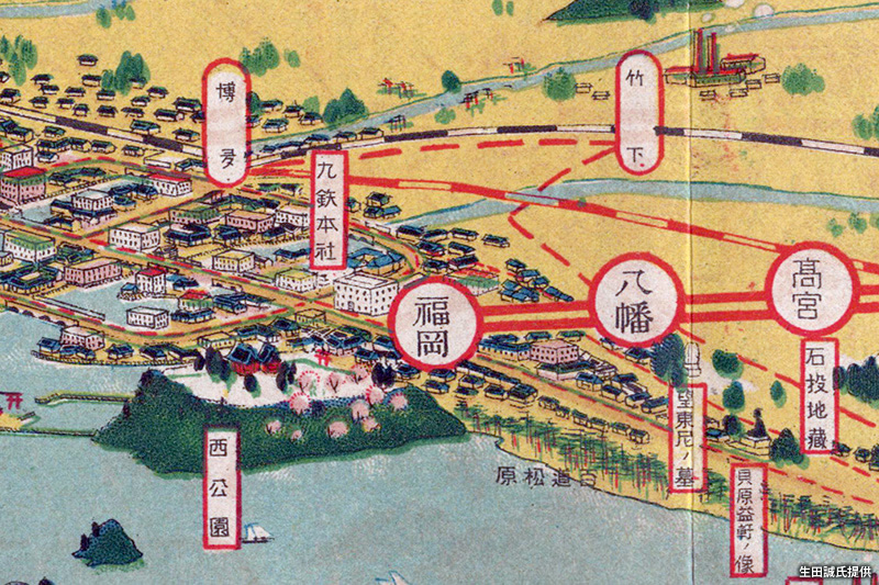 路線図は「九州鉄道」が開業時に発行した『九州鉄道沿線案内』で、鳥瞰図絵師・金子常光(つねみつ)氏により描かれている。この開業時点では「福岡駅」から「久留米駅」までの区間しか開通していないが、図外に点線で「大牟田駅」までの予定線が示されている。
