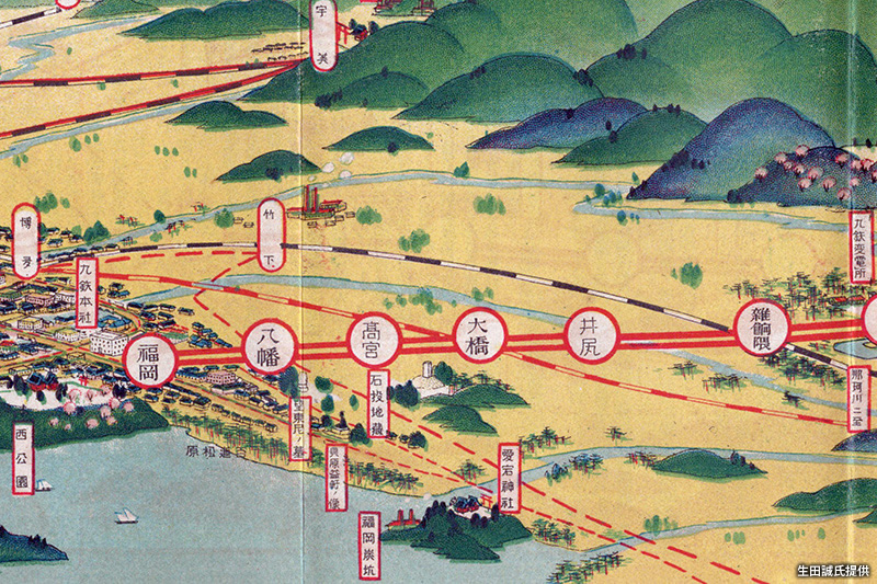 「薬院駅」は「福岡駅」(現「西鉄福岡(天神)駅」)と「八幡駅」(現「西鉄平尾駅」)の間に1927(昭和2)年に開業した駅のため、この開業当初の路線図ではまだ描かれていない。